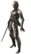 - Raiden: Heredo la Espada de Alta Frecuencia de Olga. La razón especifica por la cual usa el exoesqueleto de Cyborg Ninja, es que Big Mama lo mando a rescatar a Sunny y buscar el cuerpo de Big Boss, en la oficina 51 de los Patriots. Este recupero a Sunny y el cuerpo, pero los Patriots lo tomaron de rehén e hicieron diversas pruebas con el, hasta que ordenaron a el Dr. Madnar a transformarlo en un Cyborg Ninja. Luego, el Dr. Madnar le salva la vida. Solo su cabeza y espina dorsal son humanas.