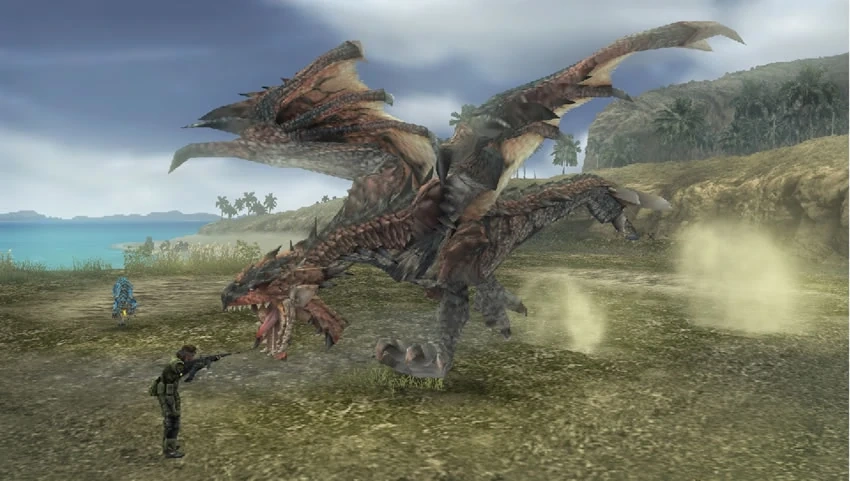 Rathalos carga contra Big Boss en la Isla del Monstruo.