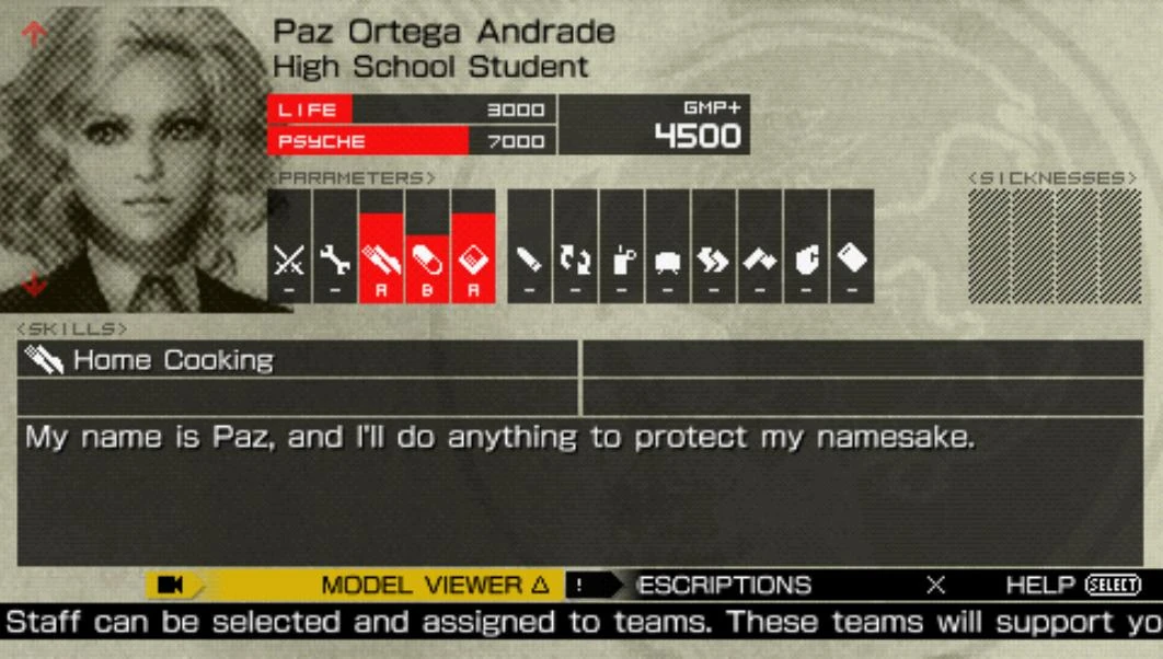 «Меня зовут Паз, и я сделаю все, чтобы защитить своего тезку». - Цитата Паз в меню персонала Материнской базы.