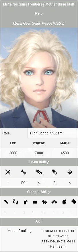 Паз - уникальный сотрудник на Материнской базе, доступный после завершения Главы 4. Она попросит Снейка позволить ей помочь на Материнской базе, так как ей больше некуда идти.