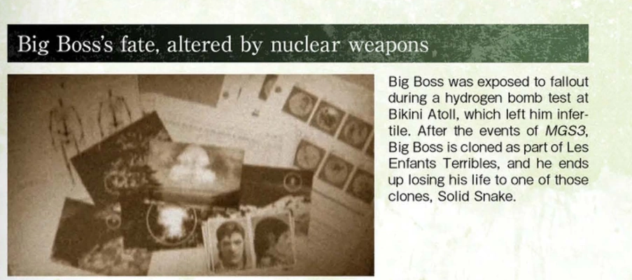 In the Darkness of Shadow Moses: The Unofficial Truth: "The man selected to serve as the genetic template for the [Les Enfants Terribles] project was the most famous living mercenary of the time, Big Boss. Big Boss was, however, incapable of reproducing, a result of past war injuries. As a result, his body cells were harvested for a cloning attempt." - ^ Metal Gear Solid: Official Mission Handbook, Millennium Books (1998).