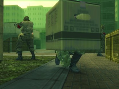 In the original Metal Gear games wearing a cardboard box makes Snake completely invisible to enemy sentries or cameras as long as the player stays still, coming into contact with enemies will still inflict damage though, even if they're not on alert mode, there is also usually only one box in each game (Minus Ghost Babel, which had 3) that works on every type of enviroment. It wasn't until the series became 3D that the mechanic was expanded upon.