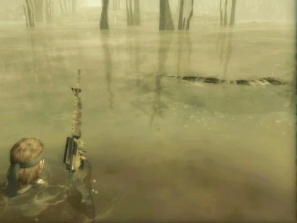 There are no guards in this area. The main hazards are the crocodiles, the risk of drowning, and the many traps first encountered here. By climbing across several ropes, the Crocodile Cap can be obtained from a ledge. The player can also swim through the pond to obtain ammunition and fish. Leeches that will inevitably stick to Snake in the water should be removed in the CURE menu, too as they will drain stamina.