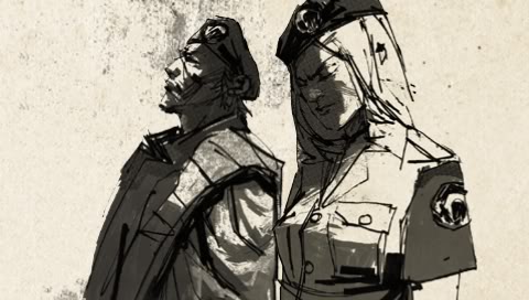 Elisa/Ursula: [Naked Snake], you will destroy Metal Gear and you will create a new Metal Gear in its place. Your children... Les Enfants Terribles. Snake, your son will bring the world to ruin, your son... will save the world." - ^ This is made particularly apparent with their playable renders in Portable Ops and Portable Ops Plus, and to a lesser extent the poster for Metal Gear Solid: Portable Ops. The in-game cutscenes do not make this clear due to the more monochrome colorization of the graphic novel-style nature of the scenes.
