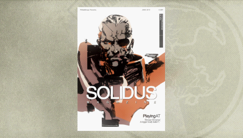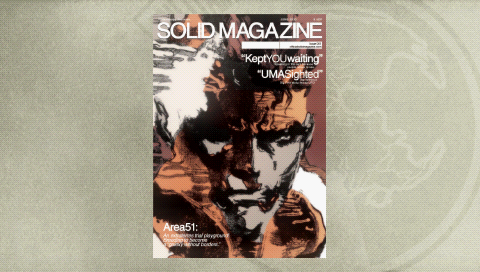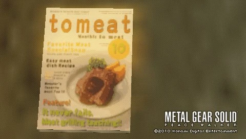The MSF also procured a set of hobby magazines while trying to destroy supplies for the Peace Sentinel in the Rio del Jade boathouse. They eventually procured copies of and copied the Solid, Liquid, Solidus, and Super magazines, which were a weekly sci-fi/horror pulp magazine, a monthly mature literary magazine, a quarterly men's lifestyle/political magazine, and a bimonthly women's fashion magazine, respectively (the latter also experiencing its 23rd anniversary during the events of the mission).[3] The Solid, Liquid, and Solidus magazines had their fair share of "adult content." They also managed to procure a cooking magazine, the Tomeat monthly magazine, which included in the then-recent issue meat grilling teaching as its feature article.[4]
