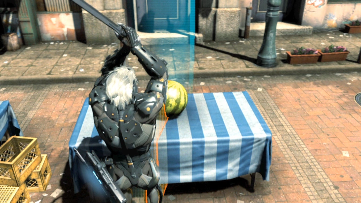 Raiden about to cut a watermelon in half in the 2010 demo.