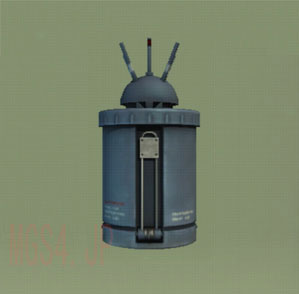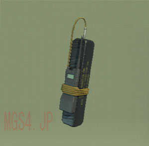 A sleep gas dispersal device fitted with a remote detonator, and is a non-lethal alternative to C4. Lacking the jumping mechanism of the sleep gas mine, it instead possesses a suction device that enables it to be affixed to walls as well as the ground. It can also be placed onto enemy soldiers. Can be purchased by Drebin for 400 DP as well as near the power station in South America, as well as at the beginning of the first act, after meeting with Drebin (in explosive barrel, at the end of the alley, next to a ruined building Snake needs to enter in order to progress further).