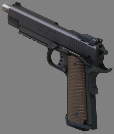 Springfield Armory's "Operator" version of the 1911 chambered in .45ACP. It is a finely-made example of an already excellent design, and was originally spec'ed with input from the FBI Hostage Rescue Team and other special law enforcement units. It has a laser sight integrated into the full-length guide rod, activated by a switch on the slide release. A flashlight can be attached to the rail system on the frame, and the muzzle can be fitted with a custom suppressor. Although somewhat difficult to fire in rapid succession, it possesses excellent close-range stopping power and impact force. Obtained from the Metal Gear Mk II.