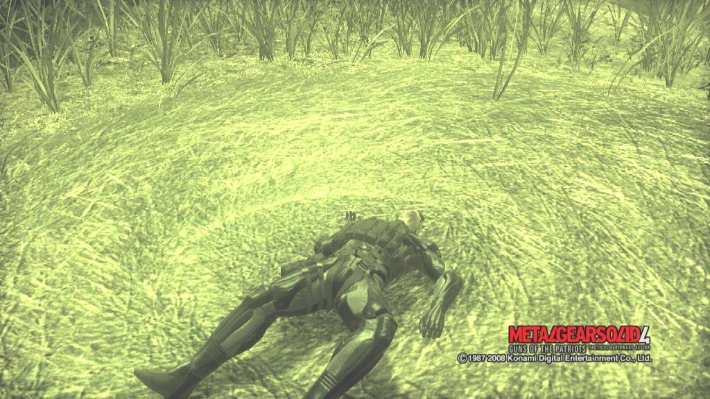 At one point on the trail, the player can discover a small crop circle. Approaching it will unlock an audio flashback to Metal Gear Solid 2 where the Colonel (GW), while under the effects of Emma Emmerich's worm cluster, tells Raiden about his being abducted by aliens. Listening to it in full will result in Snake receiving a Drebin Point bonus.