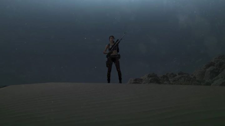 Venom Snake attempted to carry her out of harm's way through a fearsome sandstorm. He protected her and prevented Quiet from alerting a nearby convoy of their presence when she regained consciousness. Along the way, while hiding from the overwhelming number of enemies on their tail, he was bitten by a cobra, causing him to lose consciousness, both of them now blacked out and resting behind a rock. Thanks to the sandstorm, they were able to remain hidden and the convoy and patrolling troops moved on. Quiet woke up first when she heard Pequod attempting to contact Venom Snake through his radio, explaining that he wouldn't be able stay at the LZ much longer due to near-zero visibility in the sandstorm. Quiet replied in Navajo, which Pequod didn't understand and thought was just a radio problem. Thus, Quiet had no choice but to reply in English, much to Pequod's surprise, and guide the chopper to their location.