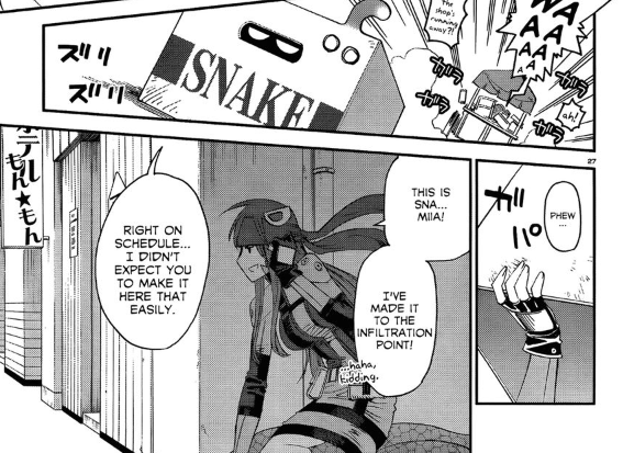 "Snake crept out of the door and onto the deck, slithered along the wall, and crouched out of sight so that he could listen in on the conversation. A man's voice sputtered through her radio. Snake assumed it was the leader, the older man he had seen earlier. They spoke Russian-the courses Snake had taken at FOXHOUND came in handy." - ^ Metal Gear Solid Guns of the Patriots by Project Itoh (English), Viz Media (2012).