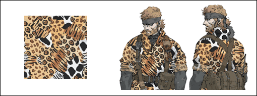 Animal – A mixture of patterns commonly seen in wild animals such as zebra stripes, jaguar spots, tiger stripes, and giraffe spots. Steadies the wearer's hand, eliminating hand trembling. Received by non-lethal victory against Ocelot. Useful on the Mountains. Featured in Super Smash Bros. Brawl. The Animal camouflage was one of four camouflage patterns implemented into the game derived from fan designs in a contest.[1] |