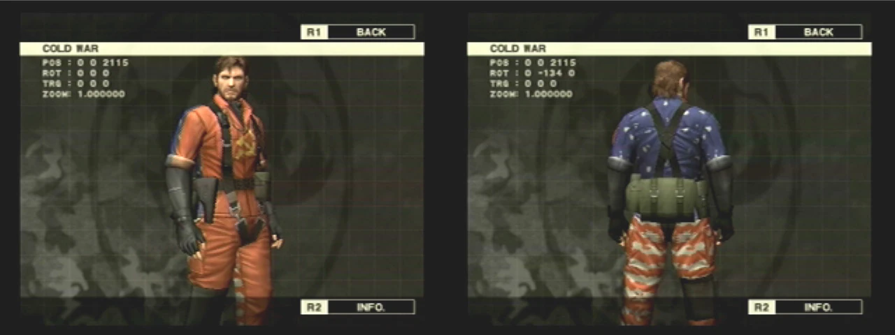 Cold War – Uniform that features the Soviet flag on the front, and the American flag on the back. Enemies will not shoot the player when they face them (however, they will shoot them from behind). Received for a non-lethal victory against Volgin. A conversation with Sigint results in Snake thinking it has other abilities other than being "stylish", much to Sigint's disgust.![]() |