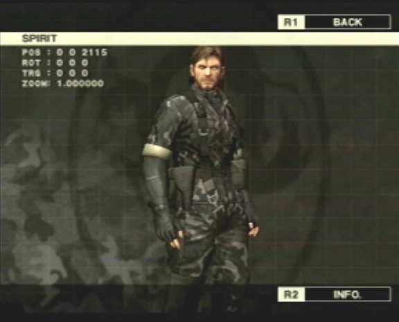 Spirit – Dark blue, gray and black spotted camouflage. Makes the player's footsteps silent to the enemy and also restores stamina while enemies are being choked. Received by touching The Sorrow's body. Calling Sigint while wearing the camouflage can result in a funny conversion, Sigint having no idea how Snake could have gotten as a "gift" from The Sorrow and then saying that he doesn't want to know, and after asking if Snake really got it from the Sorrow, deduced he might as well believe it, since Zero once stated that he was abducted by a UFO. |