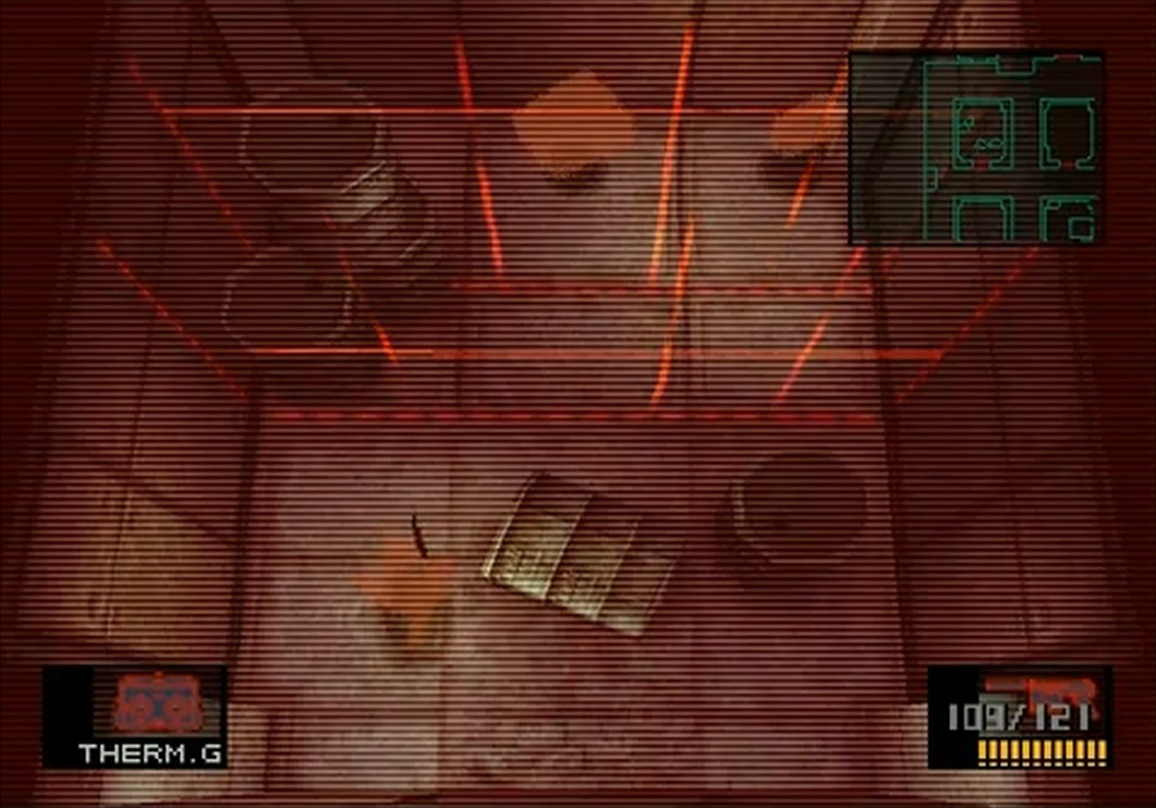 Snake avoids IR sensors in the armory with thermal goggles to acquire a PSG-1.