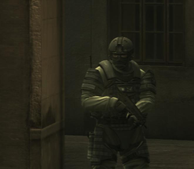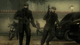 Snake and Otacon decided that the best way to locate the resistance's hideout would be to follow one of its members. With a night curfew in full effect, Snake evaded the Raven Sword PMC soldiers, and discretely assisted the resistance member in his passage through the city streets. After trailing the member to an old church, he easily forced his way inside and finally met Big Mama.