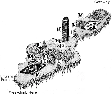 The cliffs to the south of the fortress were sharp and at a nearly ninety degree angle. The southern portion of the Fortress contained jungle and swamp environments that expanded northwards, as well as a desert environment (where the temperature difference between day and night was vast) in the center, a crevice north of the Tower Building, and highlands in the northern portion of the fortress. The fortress was also constantly under the highest alert condition (Level 1).